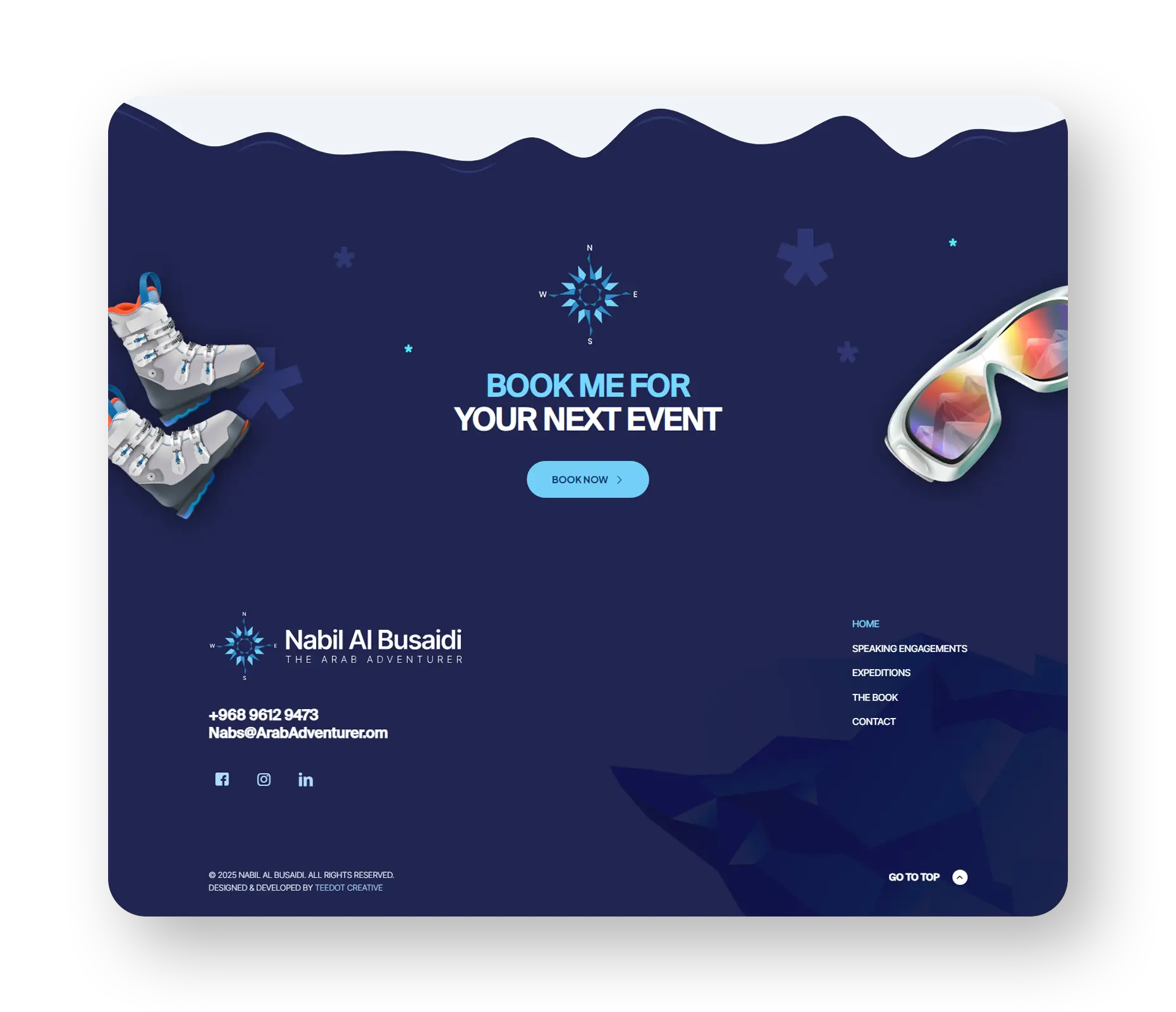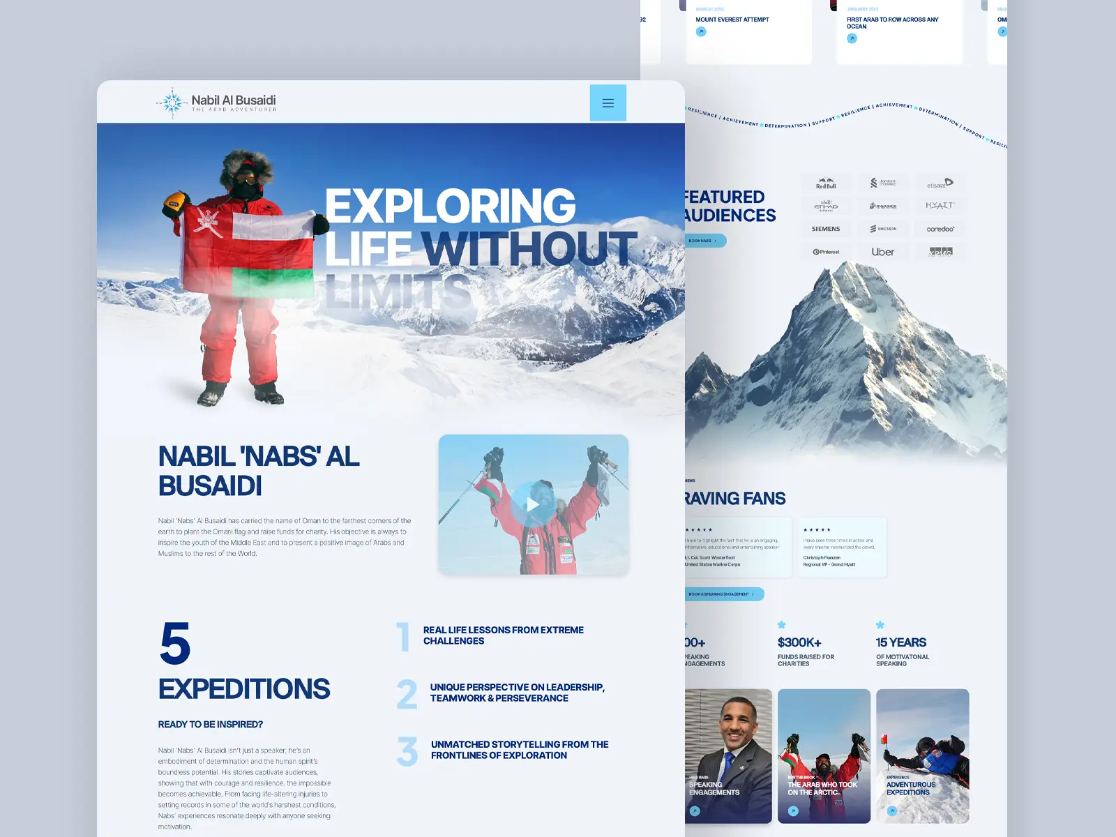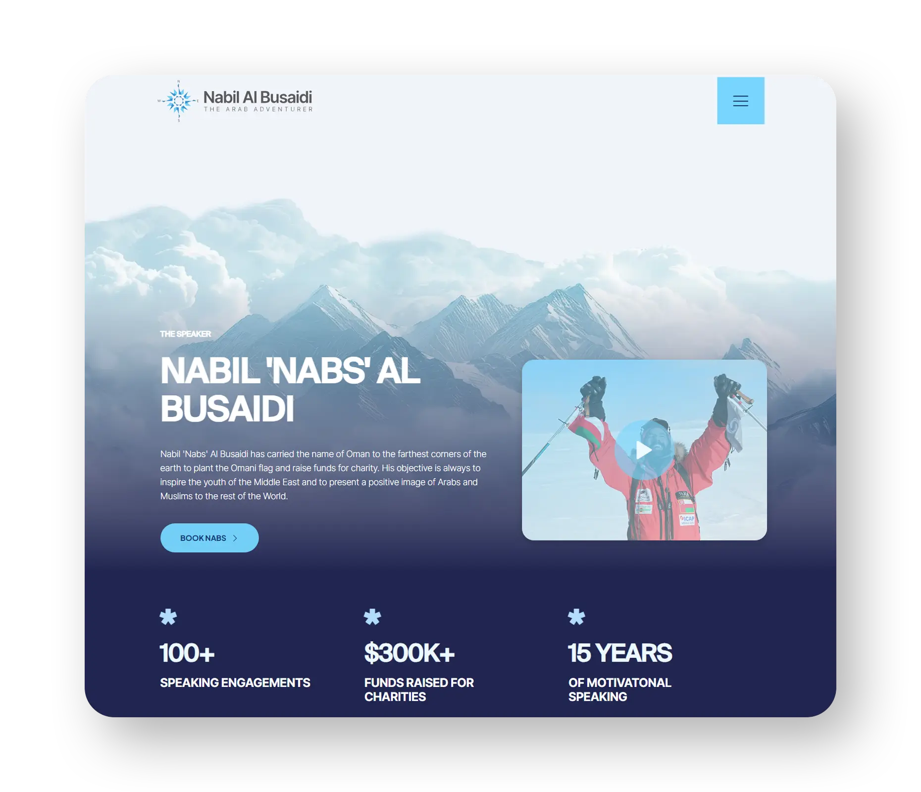 Nabil Al Busaidi, nicknamed the “Arab Adventurer,” is celebrated for his record-breaking expeditions. His mission extends beyond exploration—he seeks to inspire young Arabs to embrace challenges, push limits, and chase their own dreams. The website had to capture both his personal journey and his role as a motivational figure.