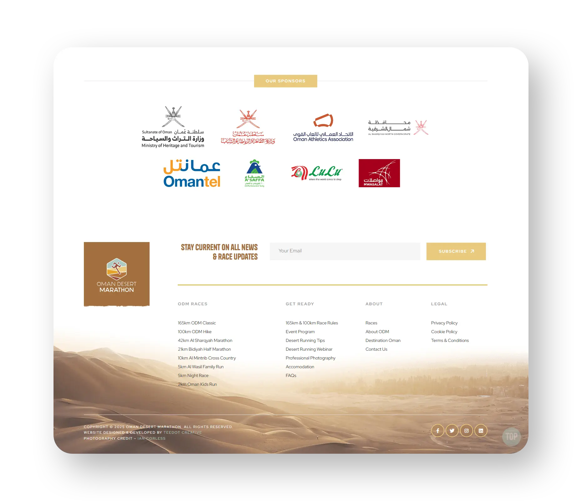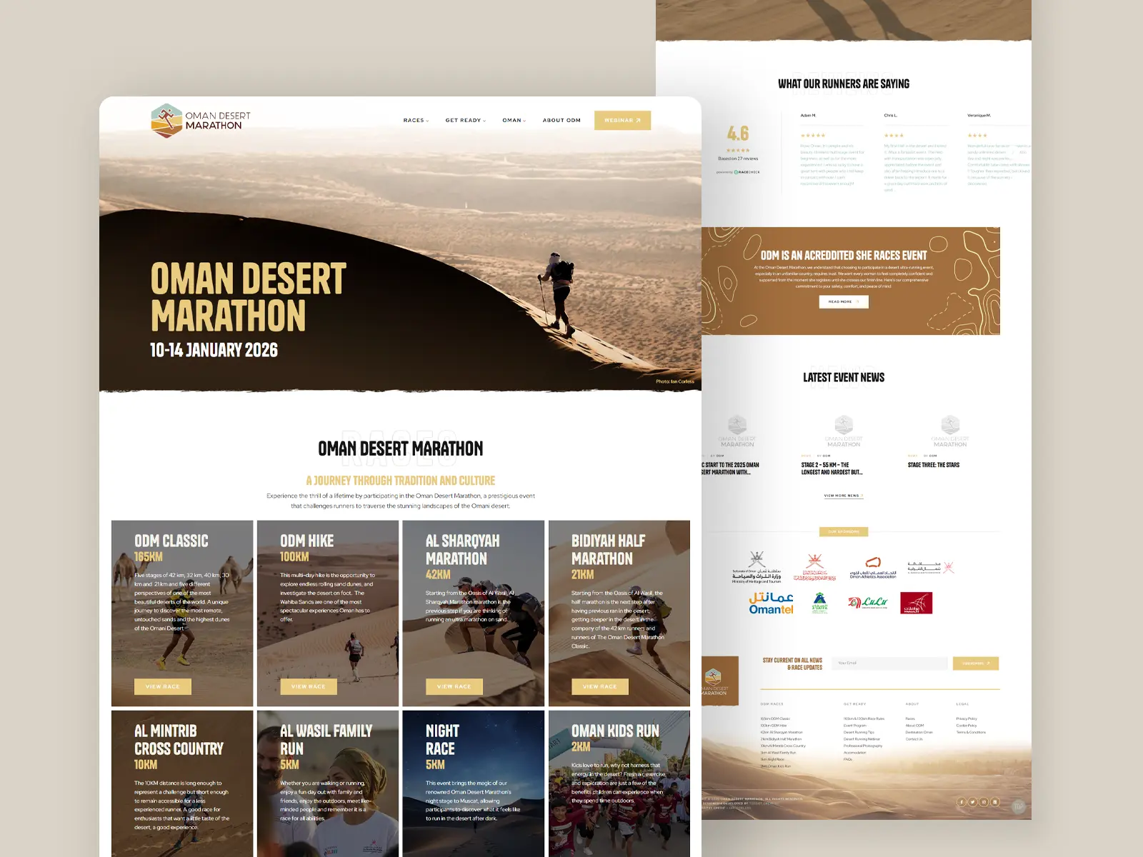 The Oman Desert Marathon attracts runners from around the world who come to test themselves across the vast dunes of Oman. With its reputation as a physically and mentally demanding race, the event needed a website that reflected both the challenge and the allure of desert ultra-marathons.